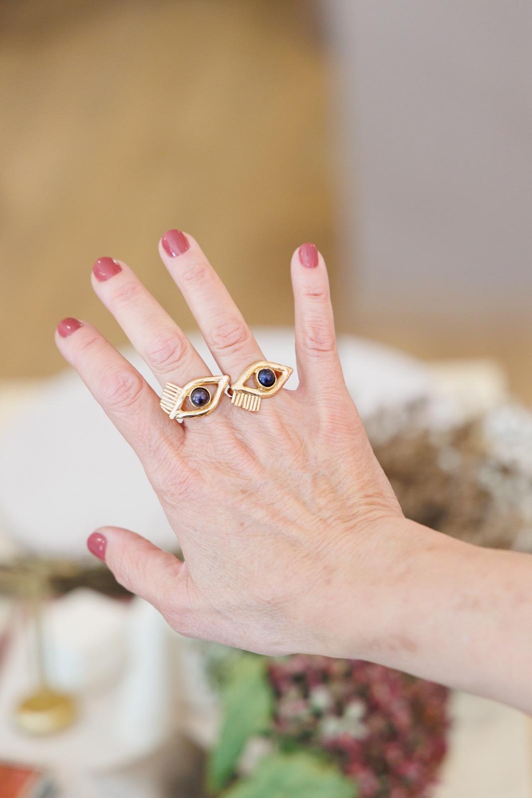 Coppia di anelli gemelli in bronzo bagnato oro 24 carati., dal profilo ovale con cabochon nero centrale. Design essenziale e contemporaneo, facili da abbinare dal giorno alla sera.