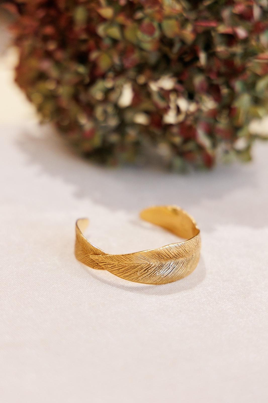 Cuff rigido dal profilo organico, inciso a nervature di foglia. Il volume è morbido e avvolgente, la finitura dorata illumina il polso senza appesantire. Perfetto da solo o in parure con orecchini e collier della stessa linea Foglia.