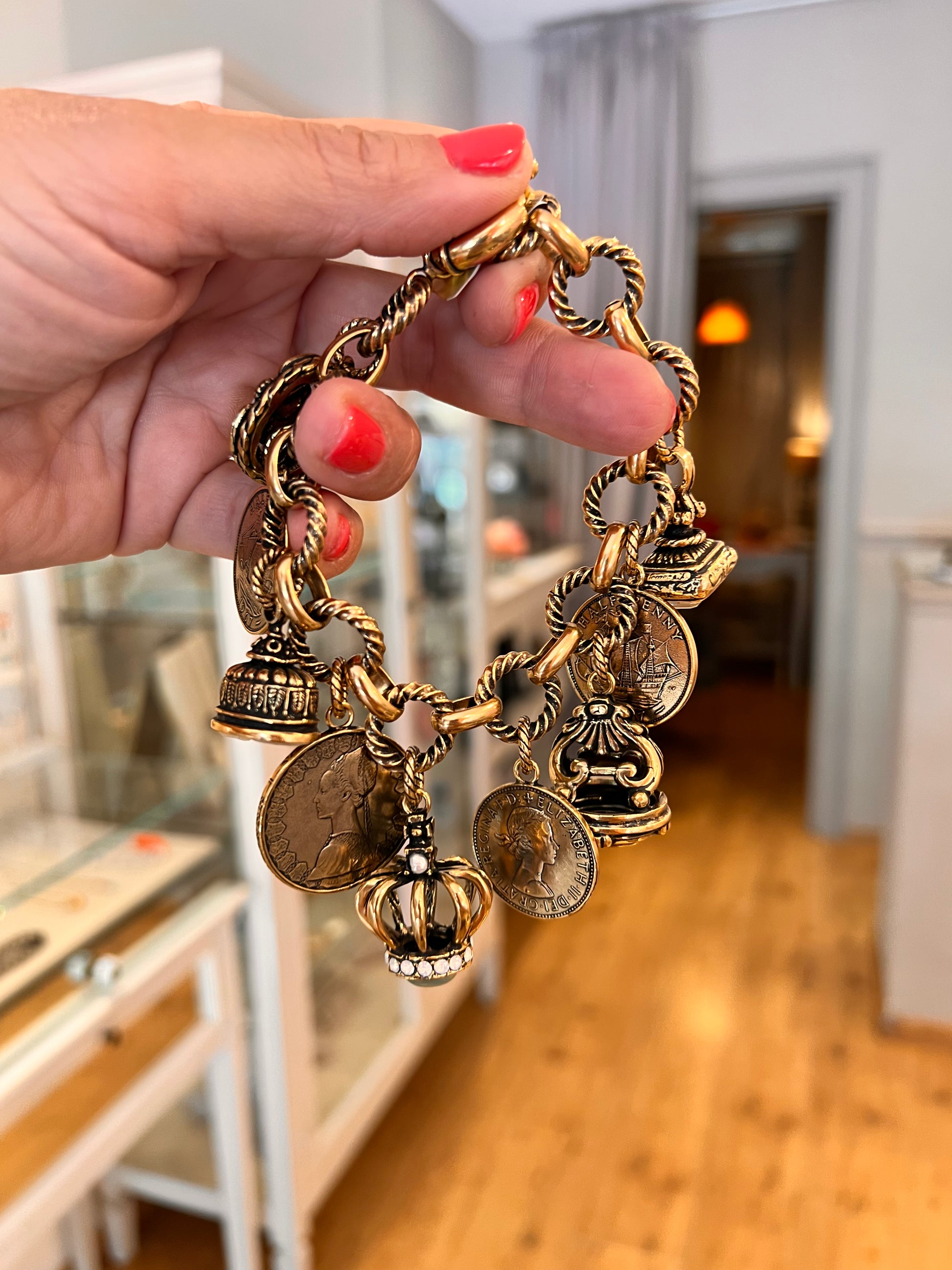 Il Bracciale Monete e Sigilli è una creazione artigianale unica, realizzata in ottone bagnato in oro con piccoli rollò. A questo si alternano incantevoli charms a forma di monete e sigilli coronati, ciascuno impreziosito da perla, cristallo idrotermale bianco, granato, cammeo, agata blu e strass. Ogni elemento racconta una storia di nobiltà, eleganza e storia, creando un mix armonioso di simboli e dettagli raffinati.