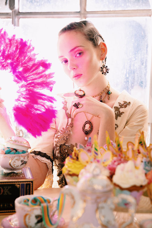 La Collana Cammeo Floreale è un gioiello di alta bigiotteria artigianale, che unisce la bellezza classica e l’eleganza raffinata. Realizzata in ottone dorato, questa collana presenta un cammeo di donna arricchito da delicati tralci e rose in Swarovski, granati, smeraldi, perle e un pendente in perla. Ogni dettaglio è progettato per raccontare una storia di eleganza e bellezza senza tempo, in un equilibrio perfetto tra passato e presente.