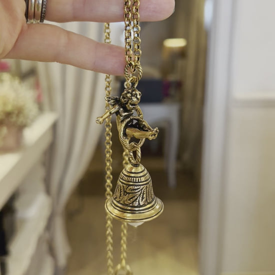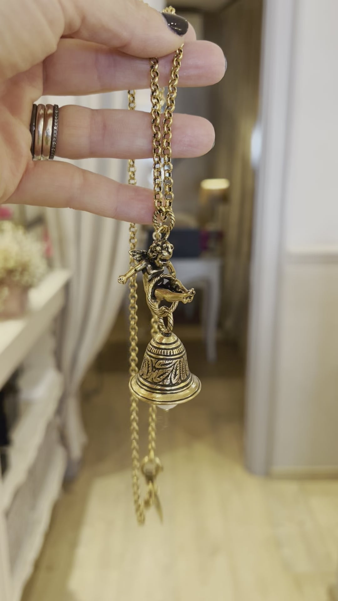 La Collana Chiama Angeli è un gioiello incantevole che unisce l’arte classica e la magia simbolica. Realizzata in ottone dorato, questa collana presenta un putto che dolcemente si dondola su una campana di perla, creando un’immagine di delicatezza e grazia. Il putto, simbolo di innocenza e spiritualità, rappresenta un angelo custode che accompagna chi lo indossa, rendendo questo gioiello un pezzo unico e significativo.