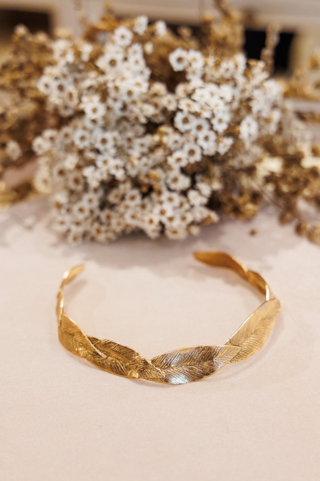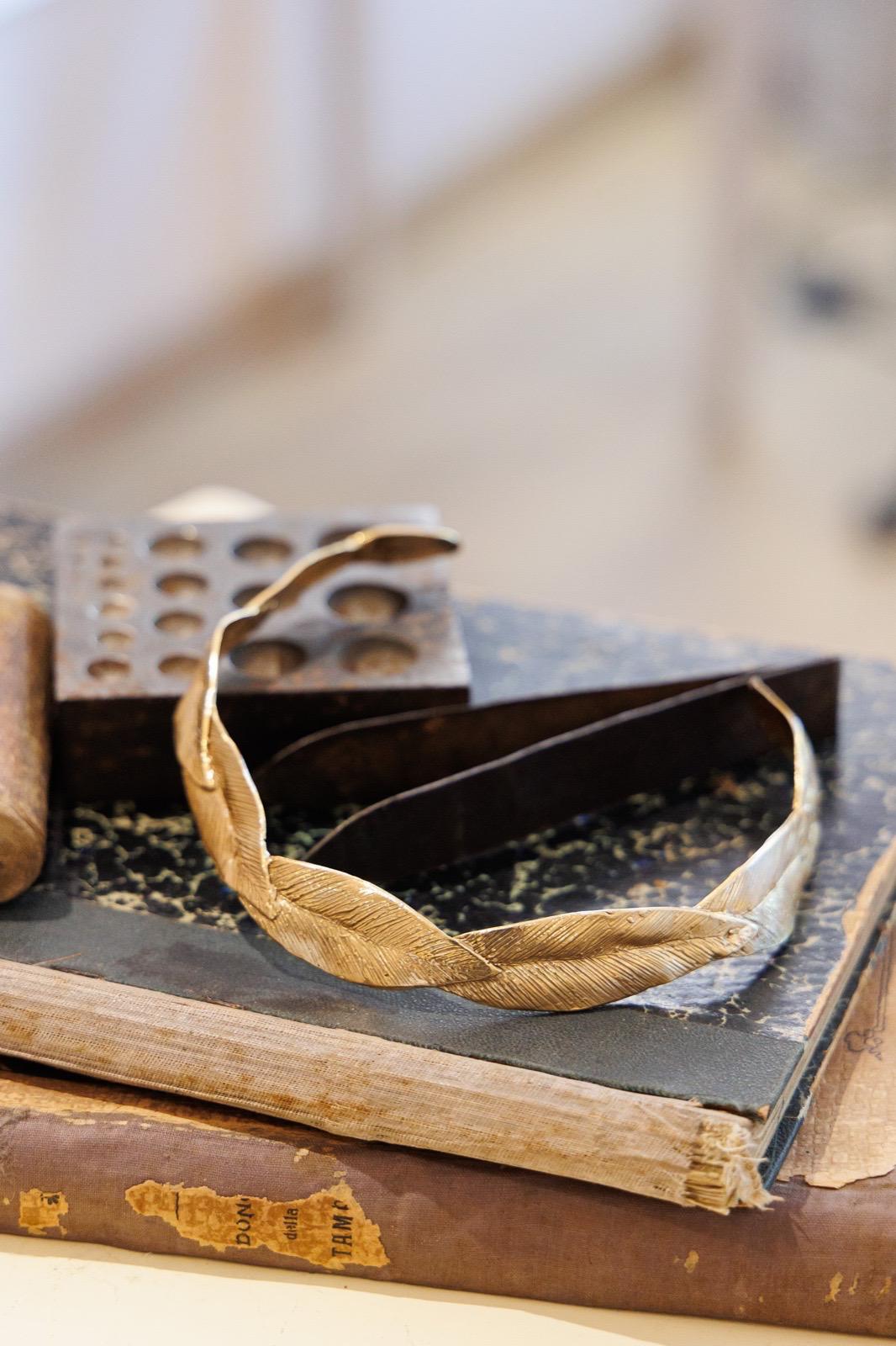 Collier rigido semi-aperto con elementi a foglia incisi e leggermente sovrapposti. Scultura luminosa che abbraccia il collo con eleganza, perfetta su camicie bianche e abiti neri. Leggero, comodo, subito “wow”.