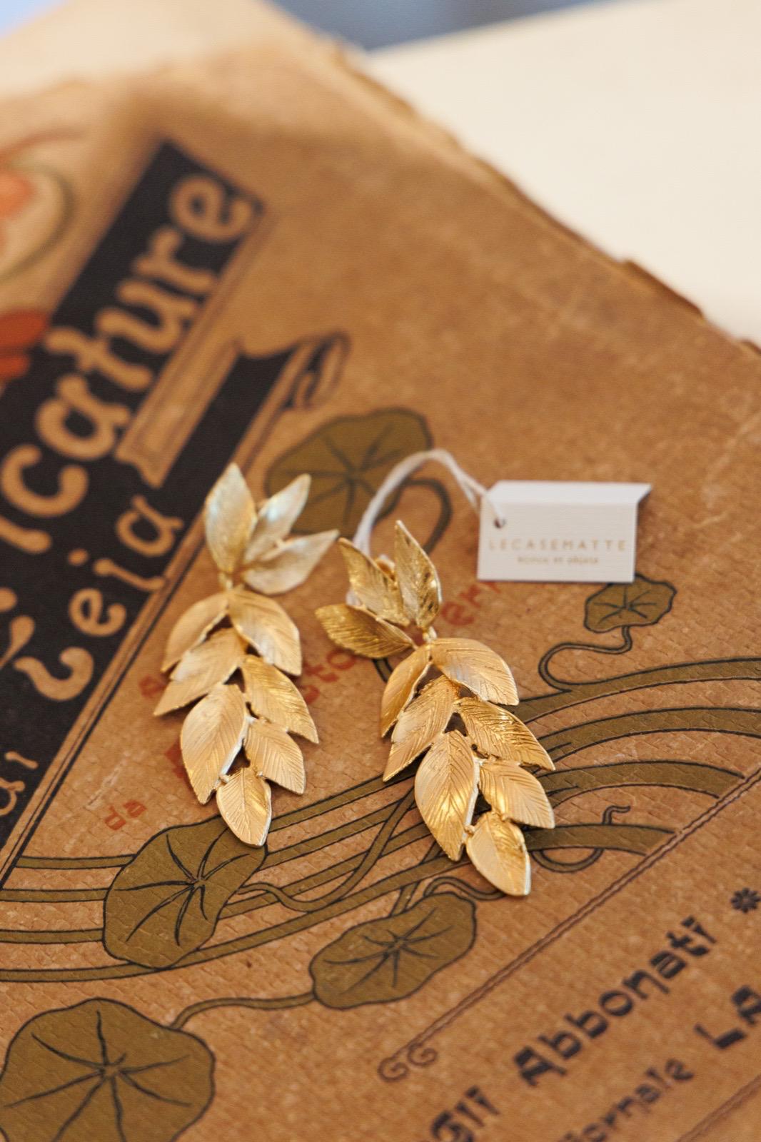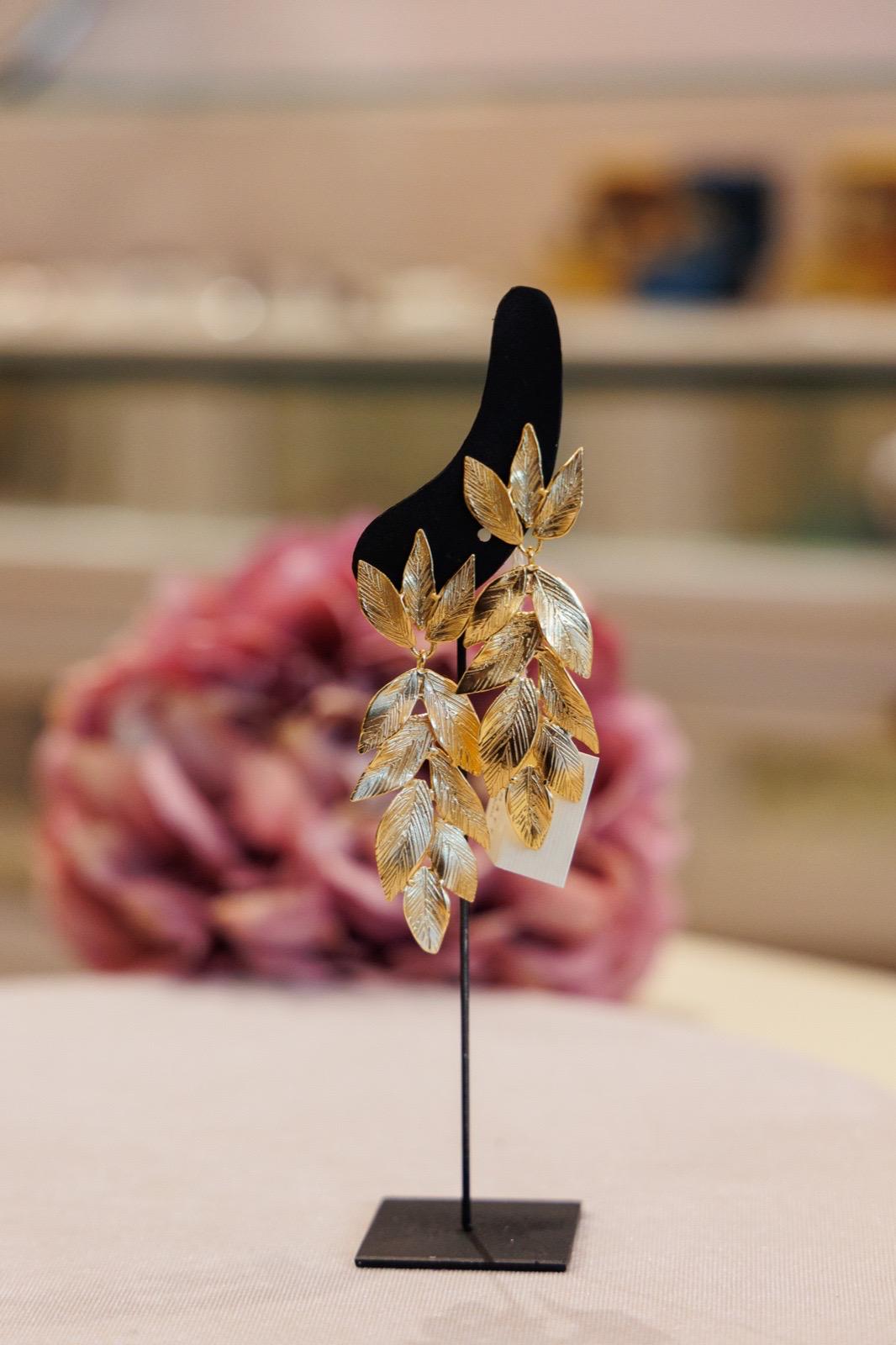 Un ramo di piccole foglie dorate che scende in verticale e cattura la luce ad ogni movimento. Lavorazione incisa effetto satinato sulle superfici, profilo lucido sui bordi: il risultato è elegante e deciso, perfetto con capelli raccolti e abiti neri.
