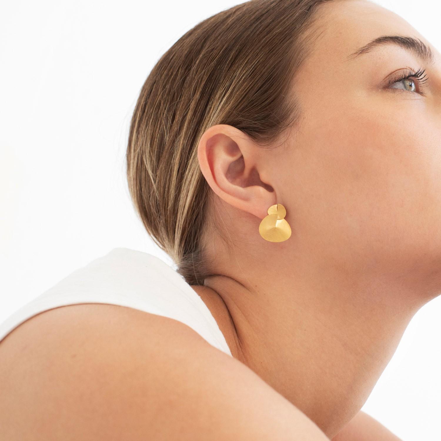 Orecchini in ottone dorato dal design geometrico, caratterizzati da due elementi circolari irregolari con texture graffiata. Un accessorio dal carattere deciso, perfetto per dare luminosità a qualsiasi look, dal casual all’elegante.