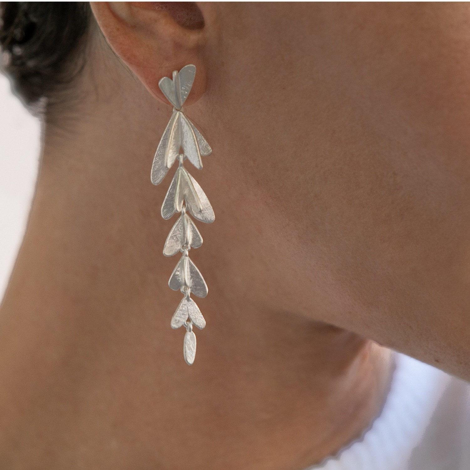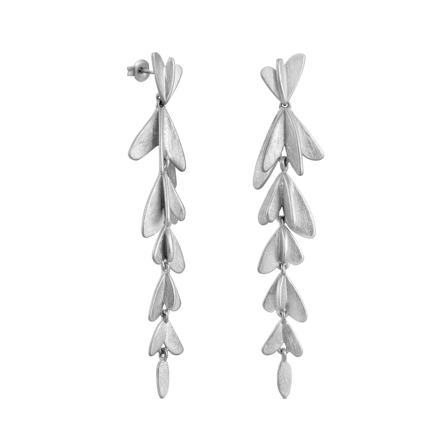 Orecchini pendenti dal design elegante e scultoreo, caratterizzati da una cascata di elementi a forma di foglia in argento.