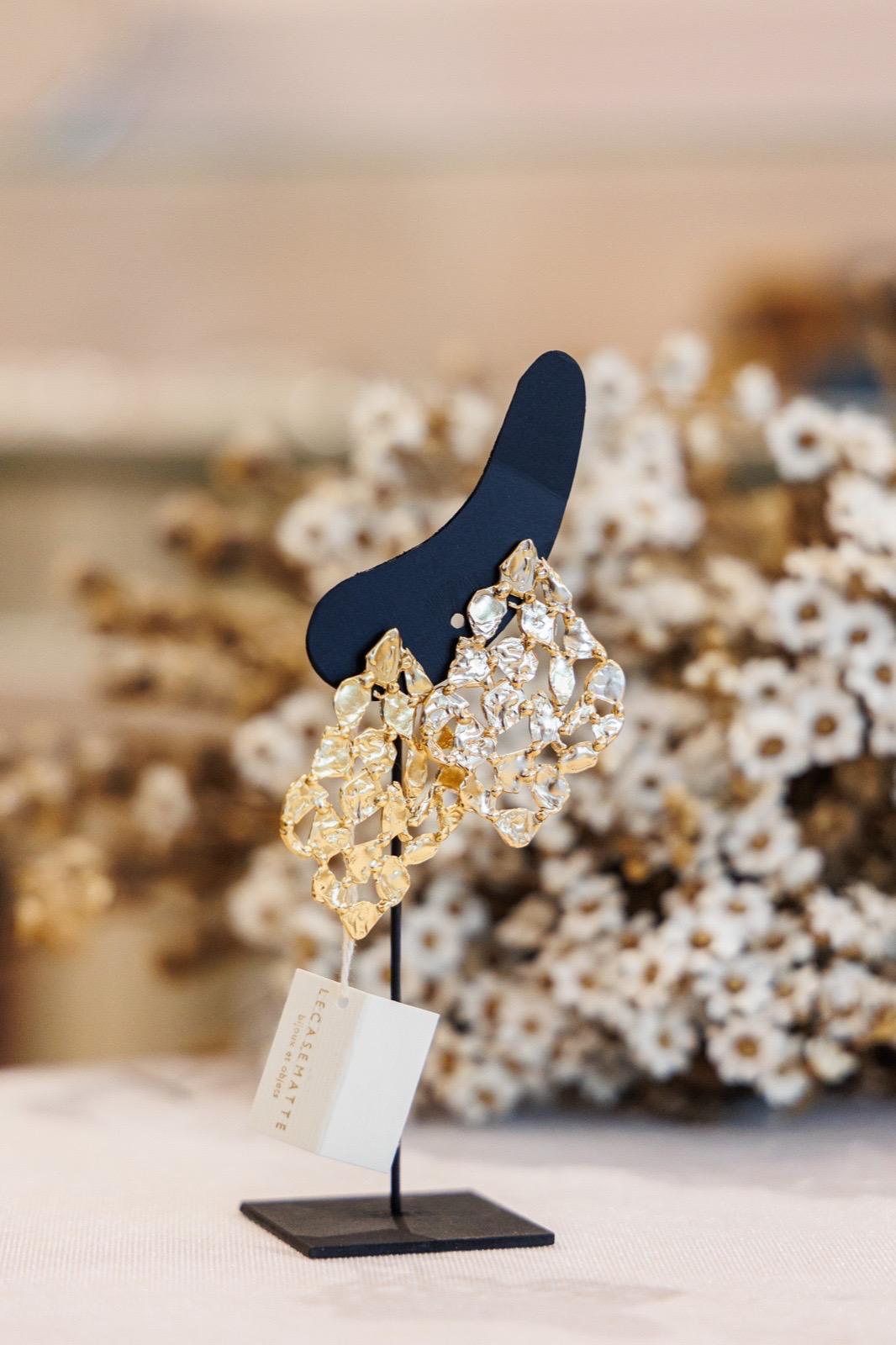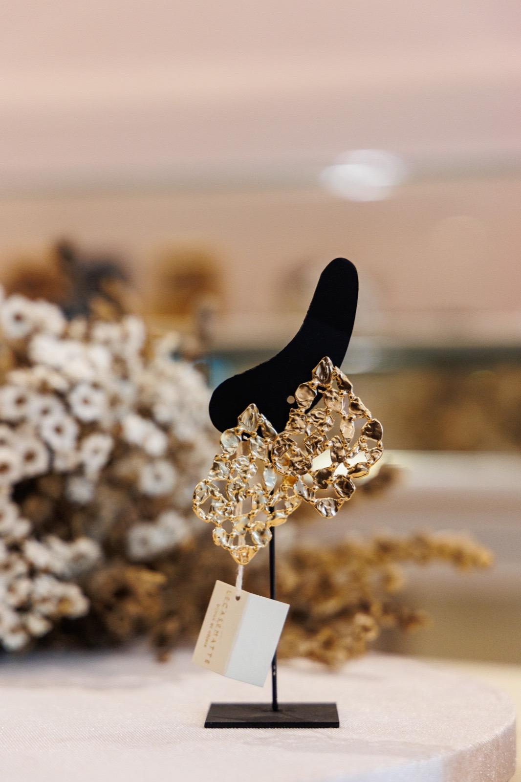 Orecchini dorati pendenti con lavorazione traforata “texture organica”: una rete scultorea irregolare che riflette la luce con carattere. Leggeri ma scenografici, si indossano con perno e farfallina e sono perfetti dal giorno alla sera. Venduti in coppia.