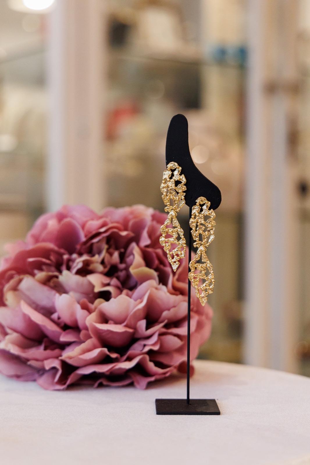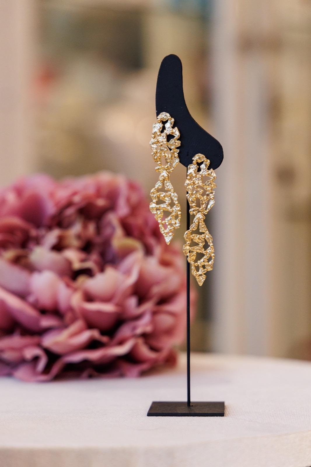 Un intreccio di piccole “schegge” dorate disegna due elementi sospesi che catturano la luce ad ogni movimento. Sono pendenti ma leggeri: nascono per dare carattere a un total black, per brillare con una camicia seta o per accendere un look da sera. Lo stile è quello di Lecasematte: materico, elegante, senza tempo.
