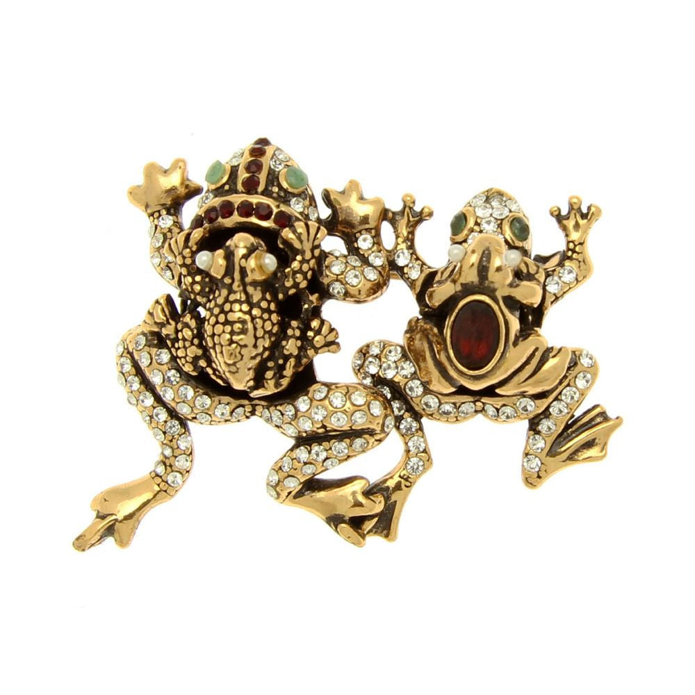 La spilla famiglia di rane è una raffinata creazione artigianale in ottone dorato, composta da quattro ranocchie disposte una sopra l’altra, appaiate e arricchite da strass, perle, granati e smeraldi. Un design che celebra la bellezza della natura e l’eleganza del regno animale. Realizzata con la tradizionale fusione a cera persa, questa spilla è un gioiello che unisce il fascino degli animali al lusso dei dettagli, un pezzo unico che cattura l’attenzione per la sua bellezza e il suo significato.