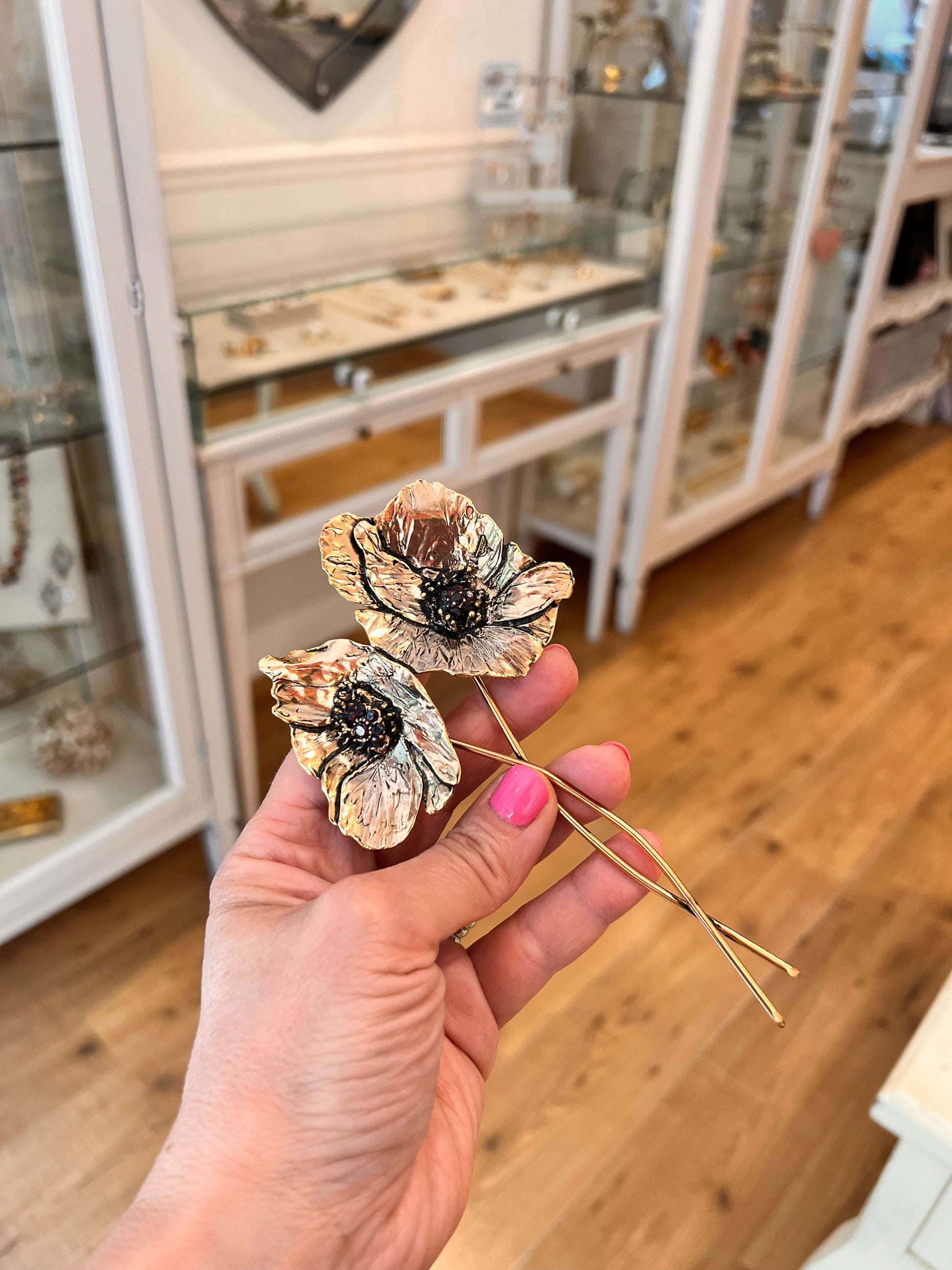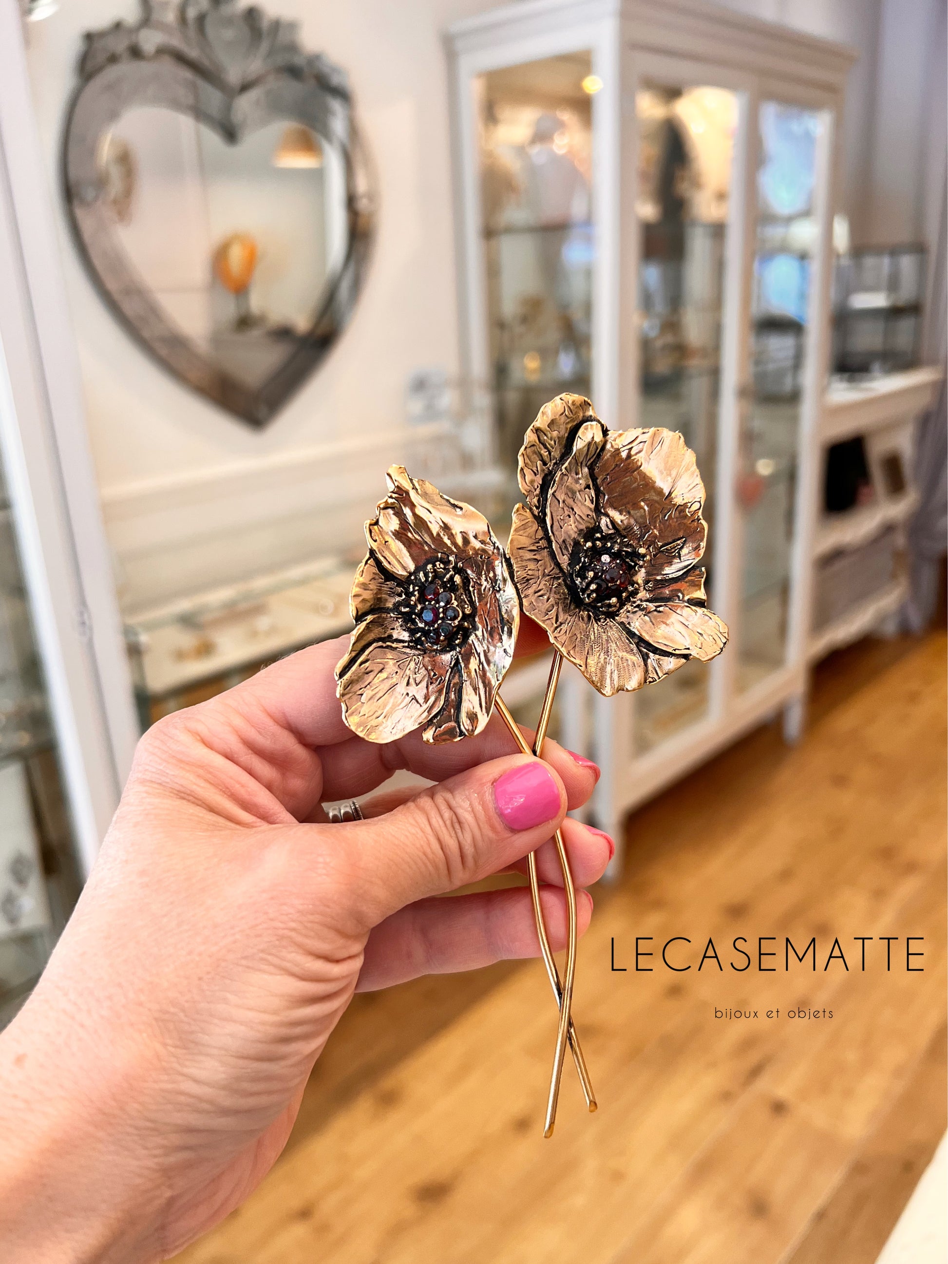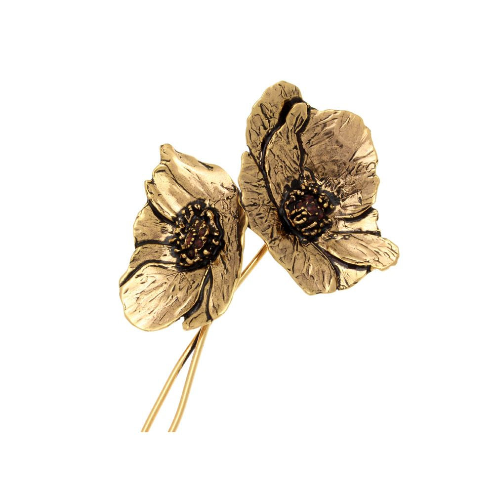 I papaveri, simbolo di passione e bellezza effimera, prendono vita in questa spilla che rappresenta la perfezione artigianale. Perfetta per arricchire ogni look con un tocco di natura e arte.