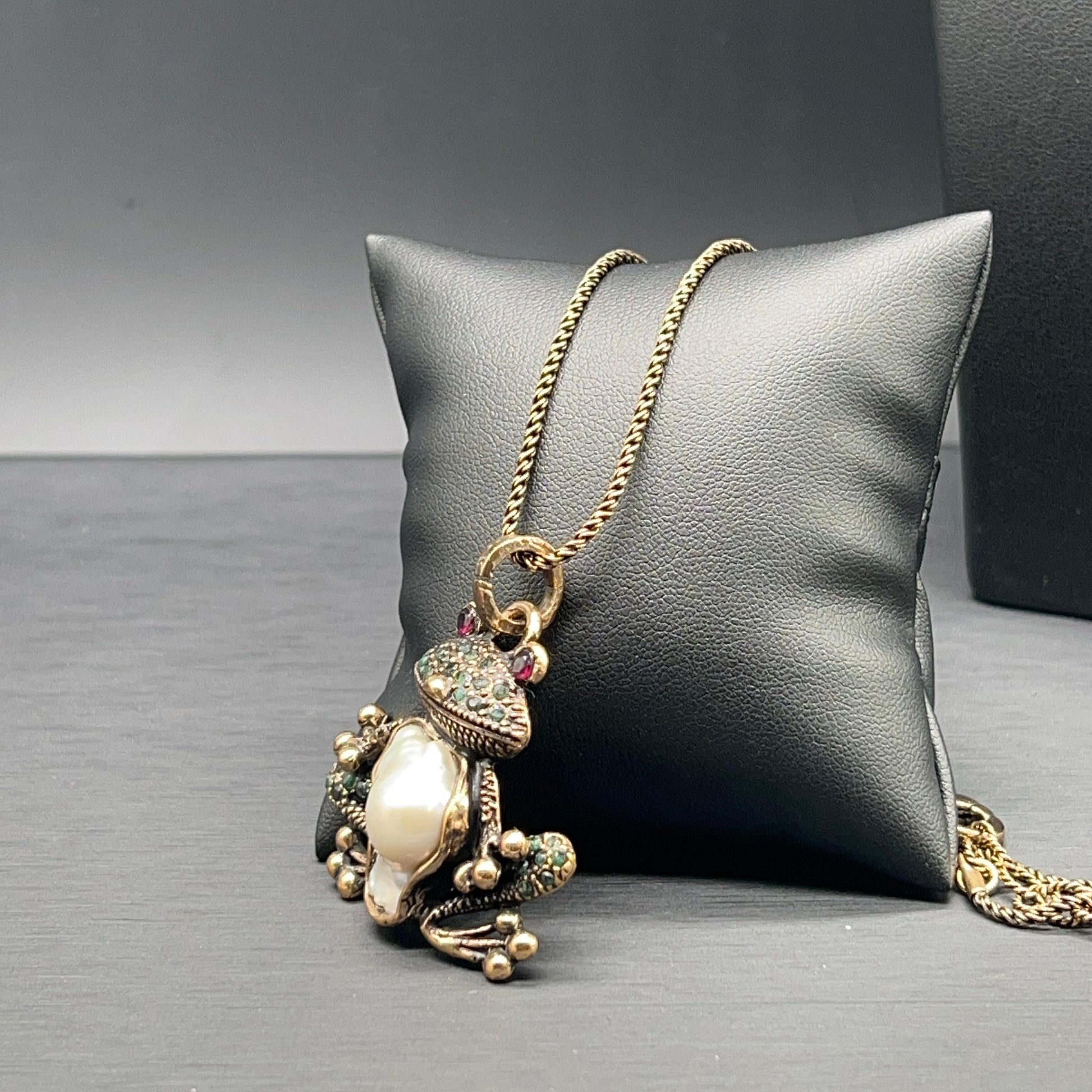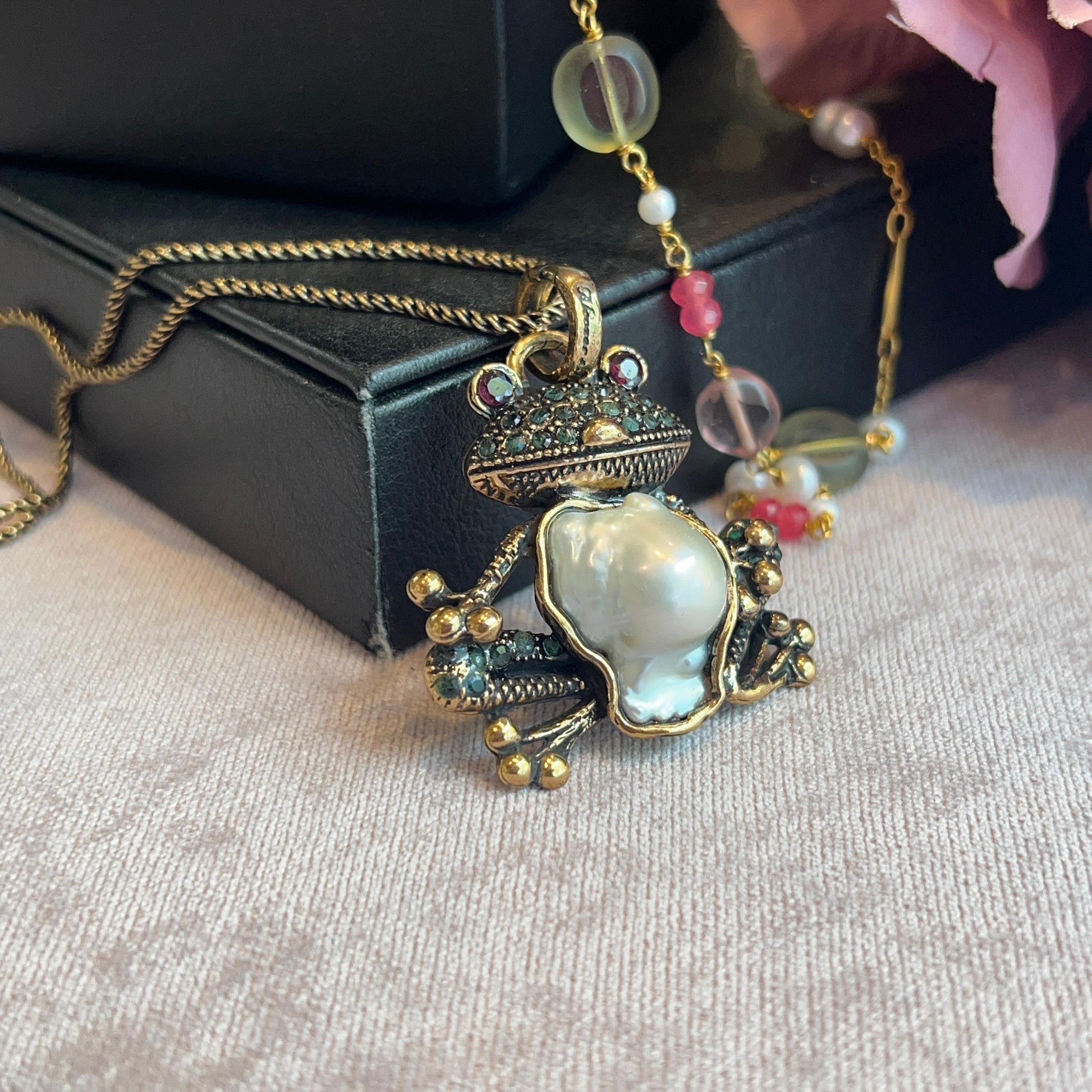 Collana in ottone placcato oro con effetto brunito e antico, realizzata con tecnica a cera persa, con pendente a rospo, perla scaramazza coltivata, smeraldi e granato. È un pezzo unico dal carattere figurativo e decorativo, pensato per chi cerca un gioiello originale e pieno di personalità.