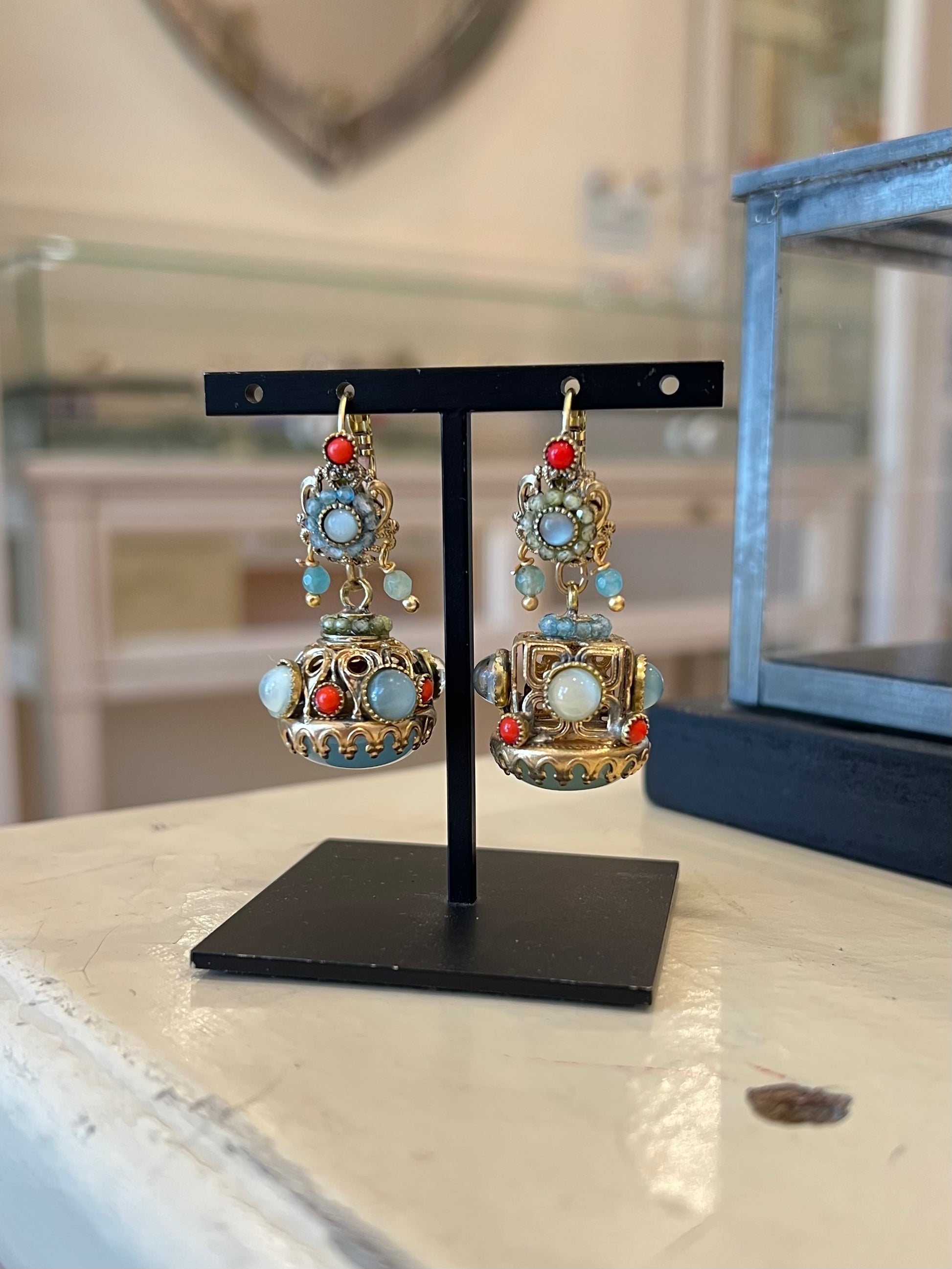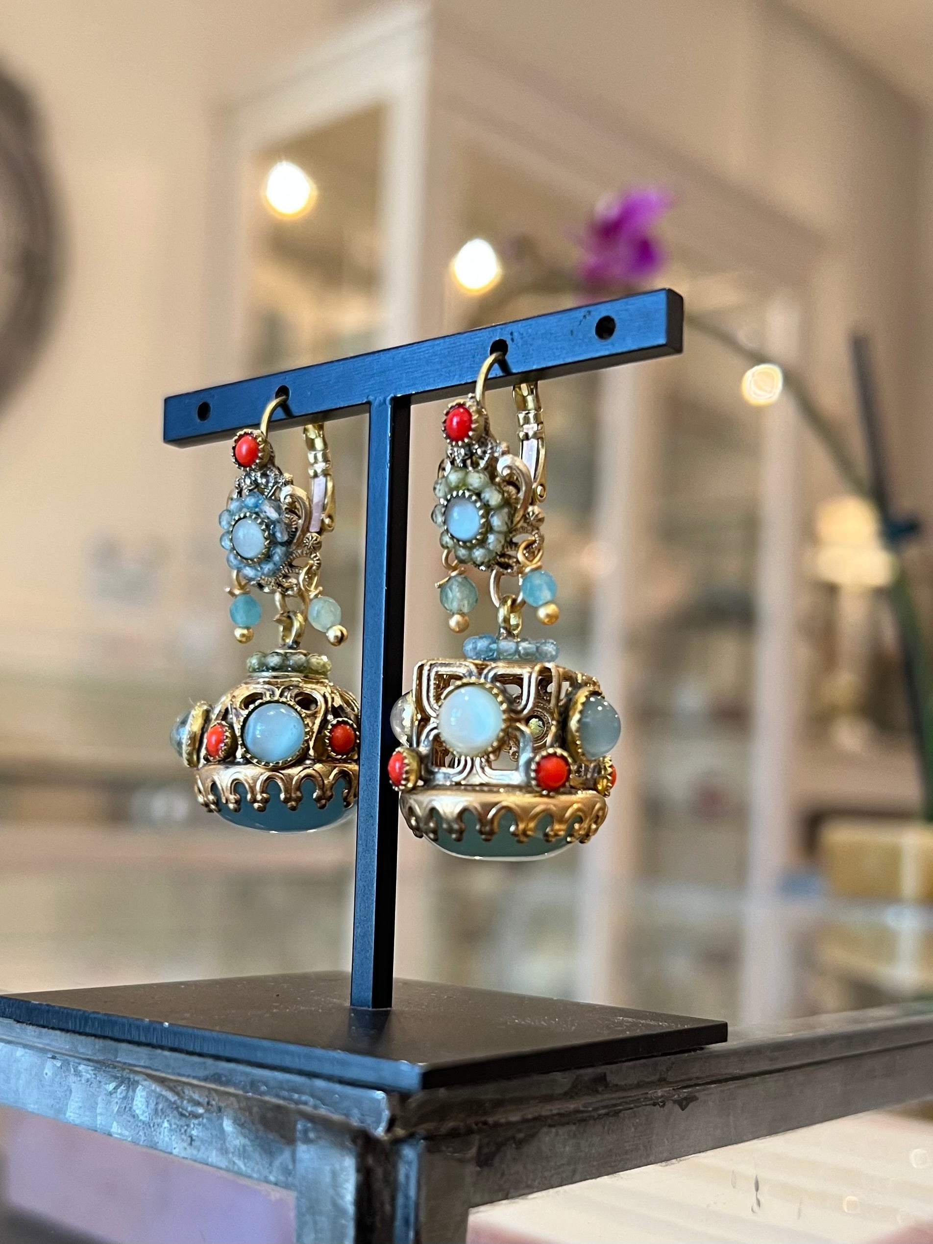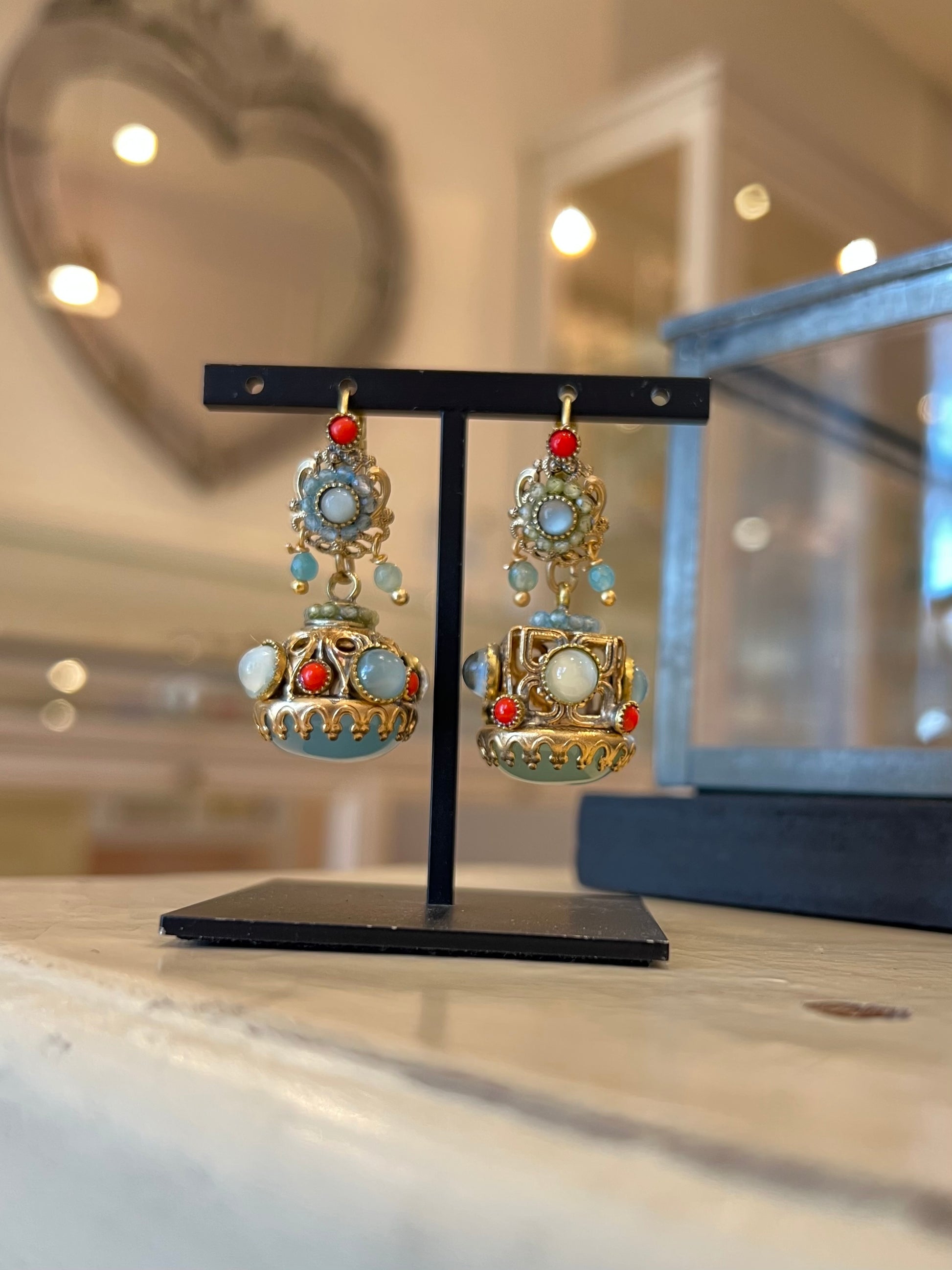 Un paio “alternativo” fatto bene: gli Orecchini a Sigillo 3 hanno quell’aria vintage che sembra uscita da un cassetto pieno di storie. Sono in ottone spazzolato, con pietre dure e paste vitree: i due orecchini non sono identici, ma riprendono la stessa palette (avorio/latte, turchese polveroso, accenti corallo) creando un effetto armonioso e super personale.