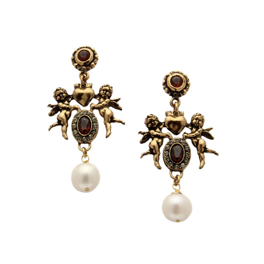 Gli Orecchini Angioletto sono una creazione delicata e sofisticata, interamente realizzati in ottone dorato. Ogni orecchino è caratterizzato da due angioletti che con grazia sorreggono un cuore e un ovale, entrambi impreziositi da granato, swarovski e una perla coltivata pendente. La combinazione di questi dettagli regala a questi orecchini una bellezza senza tempo, perfetta per chi cerca un gioiello che unisce eleganza e simbolismo.