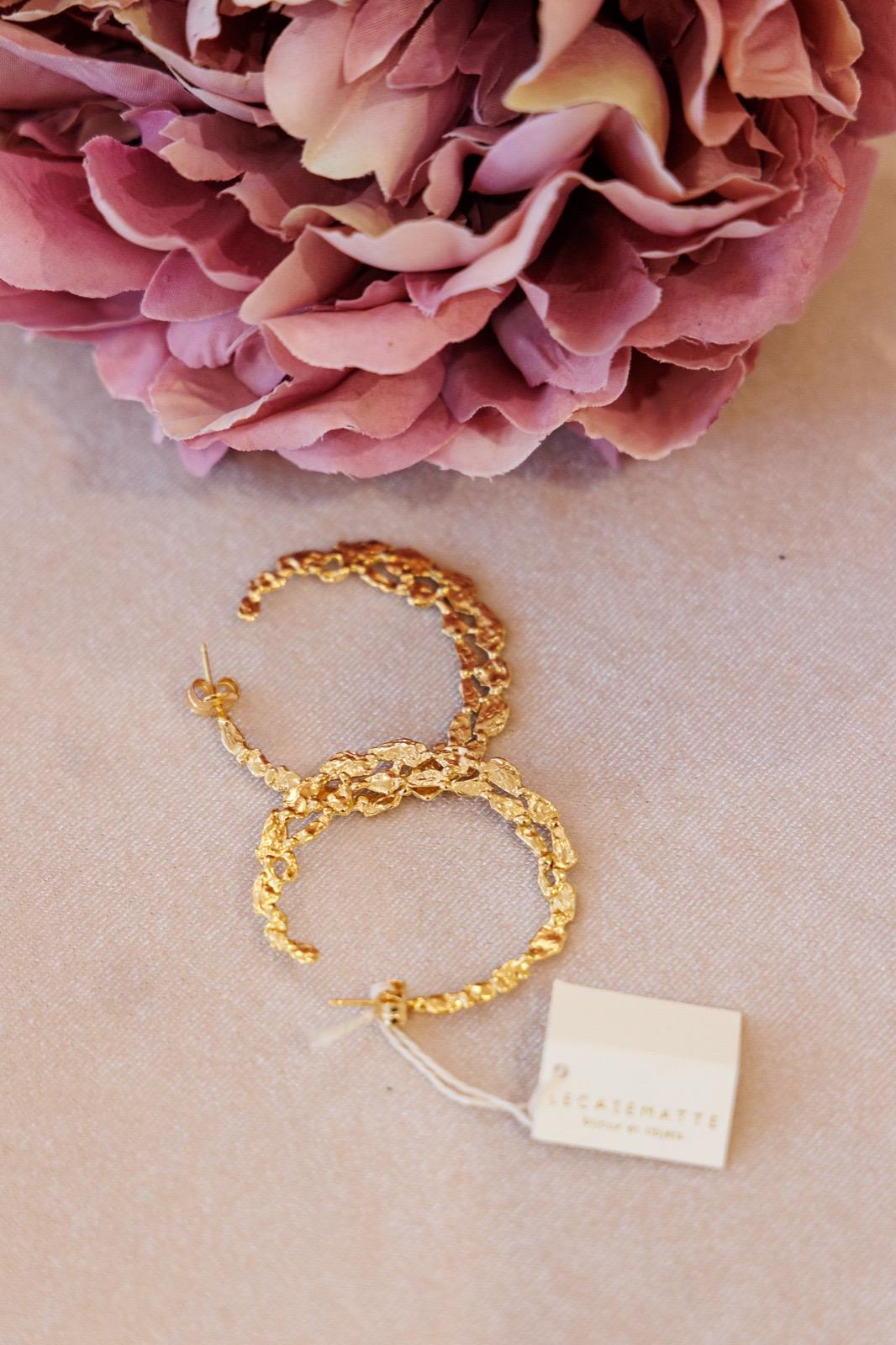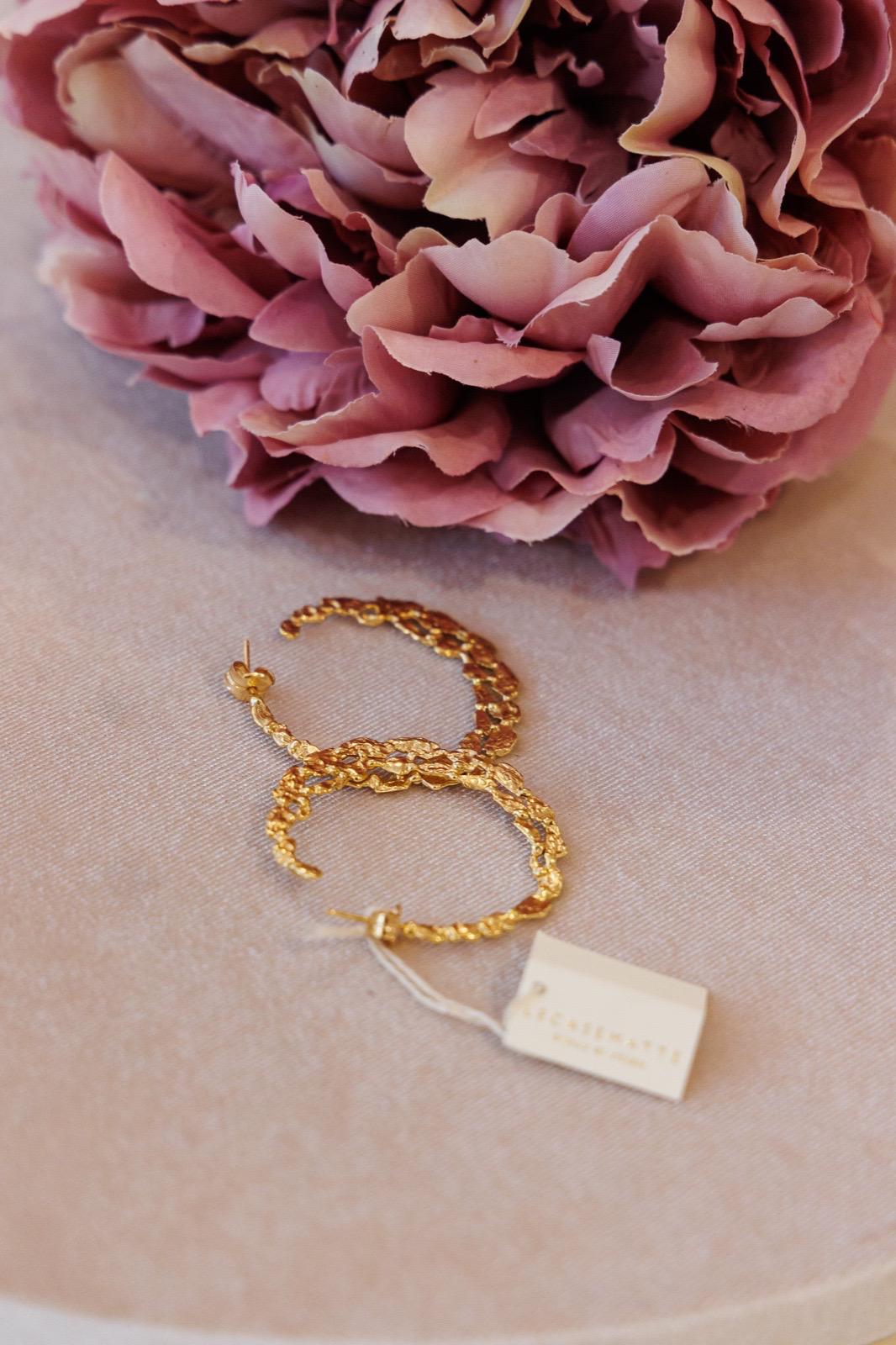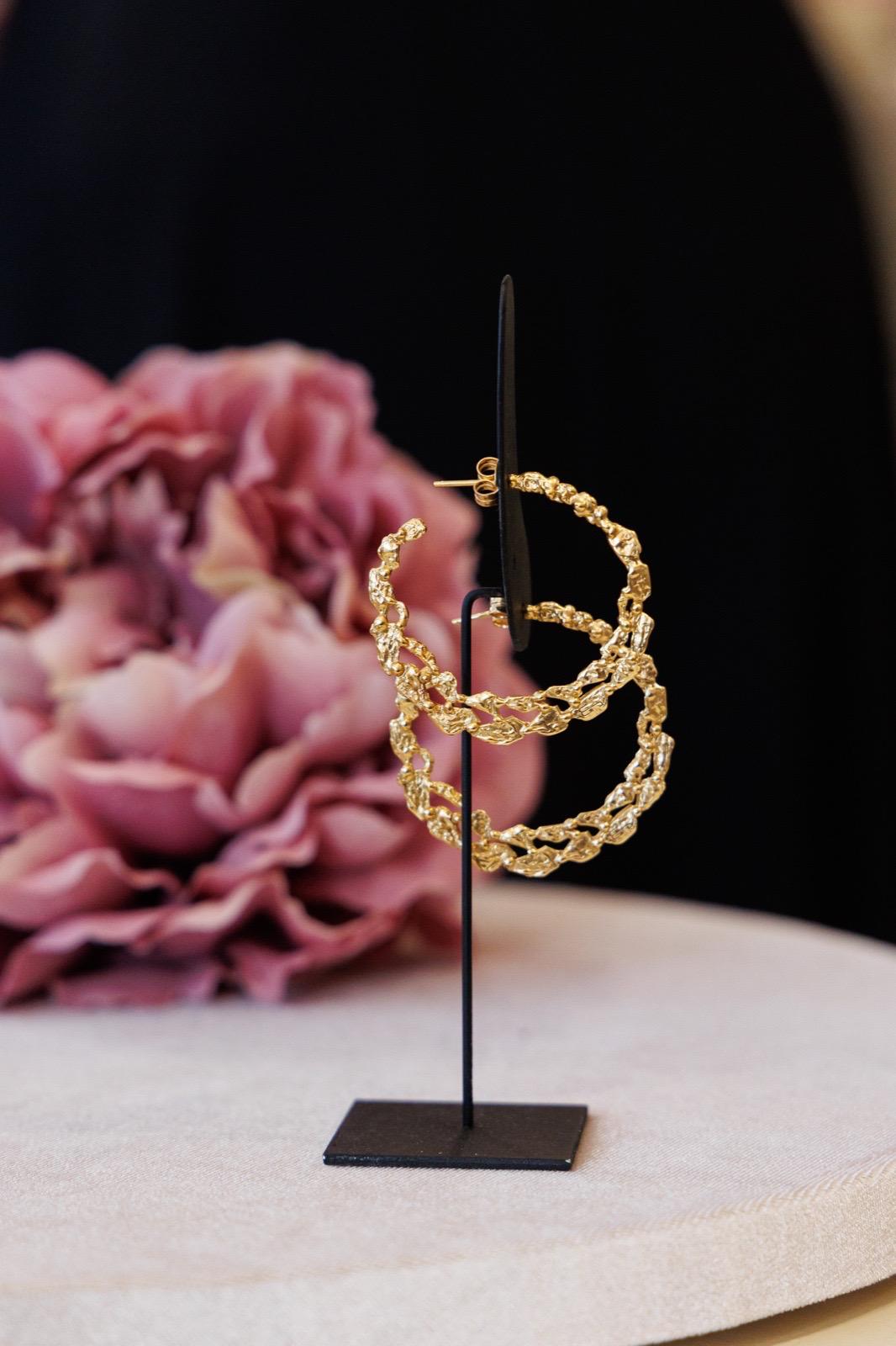Cerchi dorati dalla superficie irregolare, come piccole sculture di luce. La texture organica cattura i riflessi e incornicia il viso con eleganza discreta: femminili di giorno, decisi la sera. Leggeri, comodi, perfetti se ami un dettaglio contemporaneo che resta raffinato.