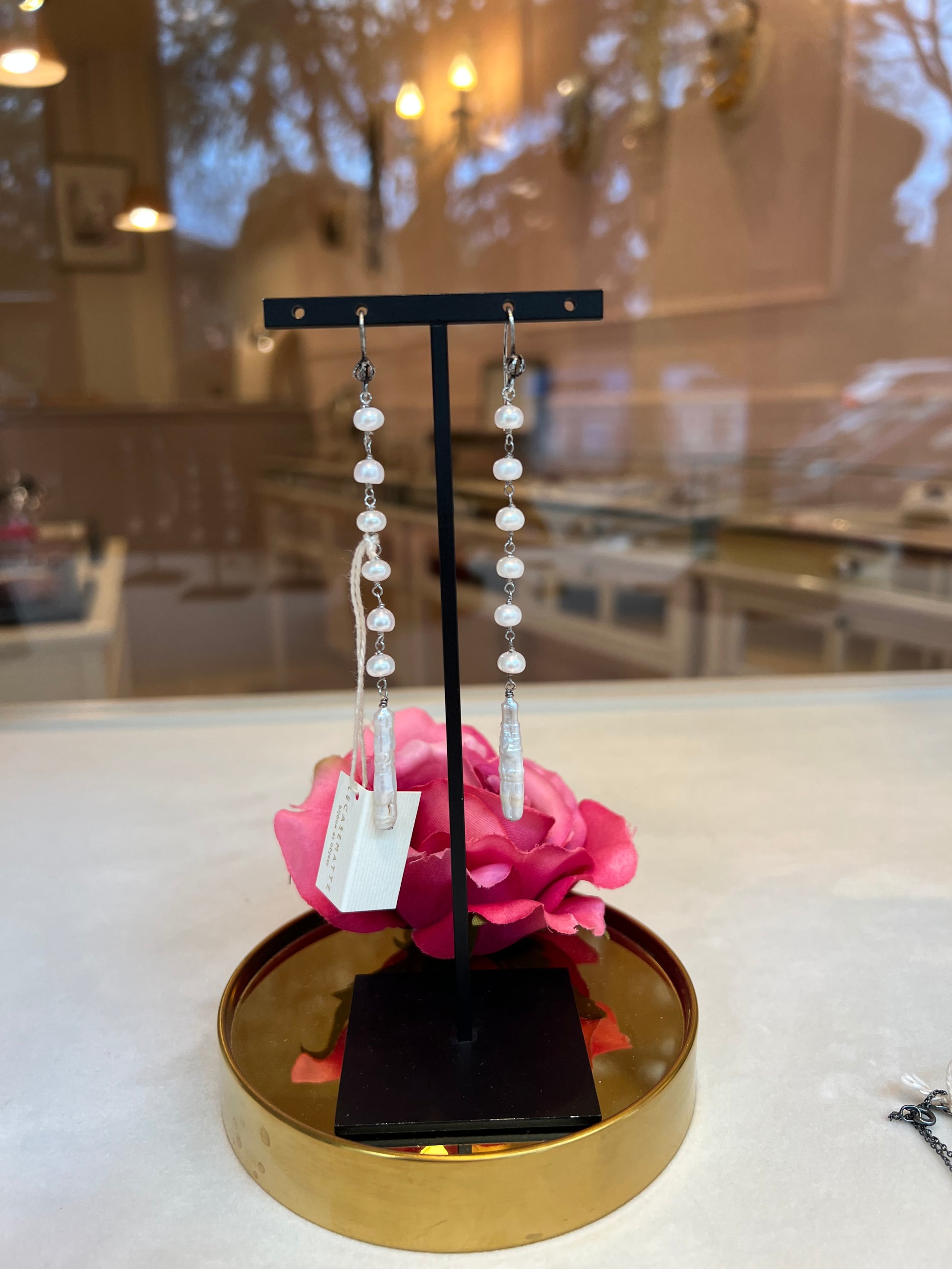 Aggiungi un tocco di classe al tuo look con questi orecchini lunghi realizzati a mano nel nostro laboratorio orafo. Le perle di fiume scaramazze e l’attacco ad amo in filigrana d’argento donano un’eleganza unica. Con una lunghezza di 9,5 cm, sono il gioiello perfetto per un’occasione speciale o per dare un tocco raffinato al tuo quotidiano. Artigianalità e bellezza si incontrano in ogni dettaglio di questo pezzo esclusivo.