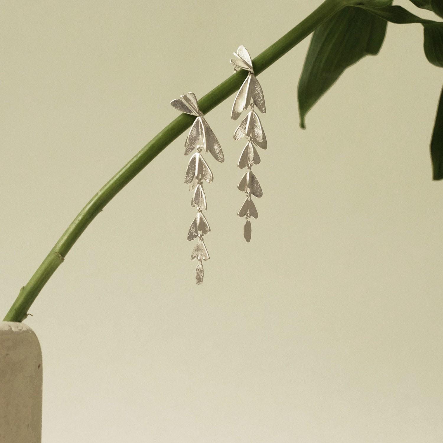 Orecchini pendenti dal design elegante e scultoreo, caratterizzati da una cascata di elementi a forma di foglia in argento.