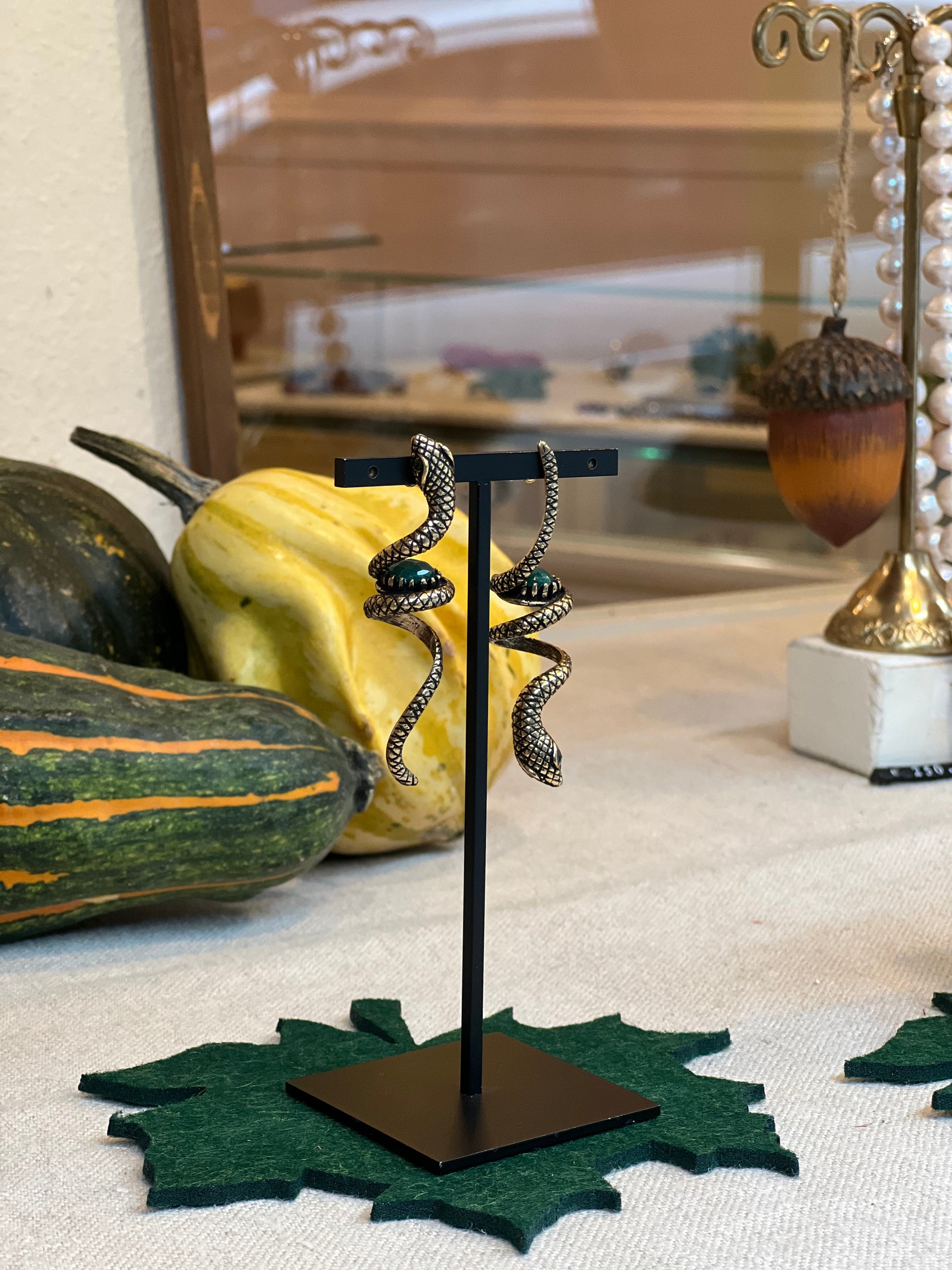 I serpenti, da sempre simbolo di trasformazione e protezione, si intrecciano attorno a due smeraldi, pietre di potere e guarigione. Questi orecchini non sono solo un accessorio, ma anche un segno di forza e saggezza, perfetti per chi desidera un gioiello che combini bellezza e significato profondo. Un’opera scultorea che cattura lo sguardo e racconta una storia di mistero e eleganza senza tempo.